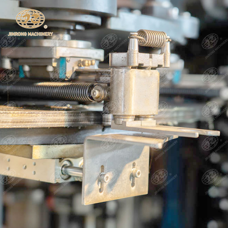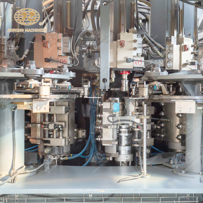 全自動旋轉(zhuǎn)式吹瓶機(jī),有進(jìn)坯斗、上料機(jī)構(gòu)、 理坯機(jī)構(gòu)、下料機(jī)構(gòu)、進(jìn)坯盤、加熱器、出坯盤組成的加熱系統(tǒng),由合模機(jī)構(gòu)、拉伸氣缸、封口氣缸組成的拉吹機(jī)。吹瓶設(shè)備特征在于所述的加熱系統(tǒng)和拉吹機(jī)安裝在同一臺機(jī)座上,電箱安裝在機(jī)座內(nèi)的右后角,進(jìn)坯斗、上料機(jī)構(gòu)、 理坯機(jī)構(gòu)、下料機(jī)構(gòu)安置在電箱和加熱器之間。拉吹機(jī)是四個工位,在四個工位的拉吹機(jī)旁安裝一個取坯夾手機(jī)構(gòu)和一個取瓶夾手機(jī)構(gòu),在取坯夾手機(jī)構(gòu)和取瓶夾手機(jī)構(gòu)中分別有兩個取坯機(jī)械手和兩個取瓶機(jī)械手。實用新型旋轉(zhuǎn)式吹瓶機(jī),布局非常緊湊,節(jié)約了占用空間,縮短了傳遞間距,大大降低成本,并且整機(jī)為一整體,吊裝、運(yùn)輸時無需拆分。